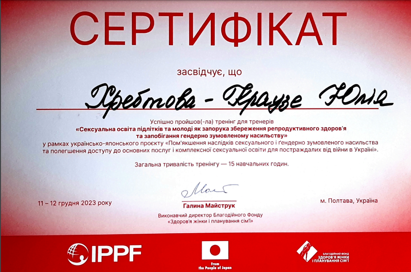 Дипломований психолог, кризовий психолог, консультант позитивної психотерапії. Маю спеціалізацію з травмофокусованої когнітивно поведінкової терапії, психолог вищої кваліфікаційної категорії, психолог методист, дійсний член Всесвітньої асоціації позитивної психотерапії (WAPP), Національної Психологічної Асоціації України та Association for Сomplex Trauma UK. ЛГБТ френдлі.