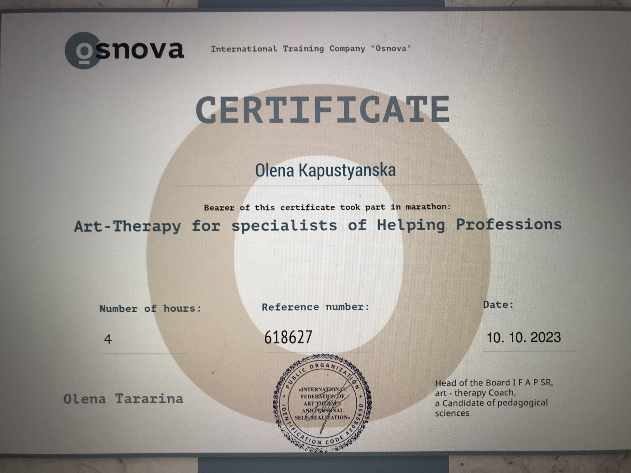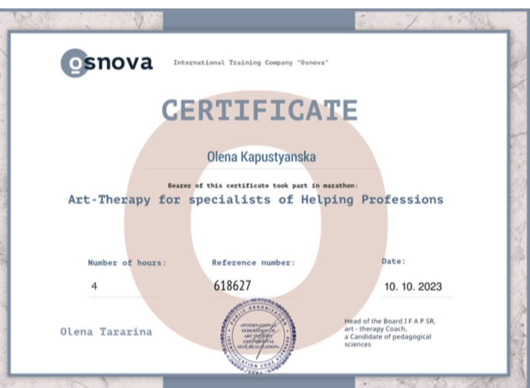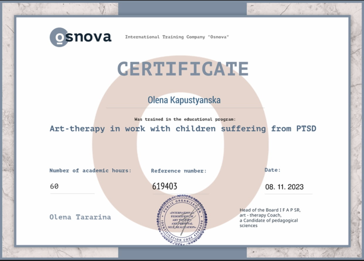 З дорослими проводжу тренінги на різну тематику (страхи, образи, робота з жіночністю, прийняття вибору, робота з "субособистостями" та інше за методами Арт-терапії.